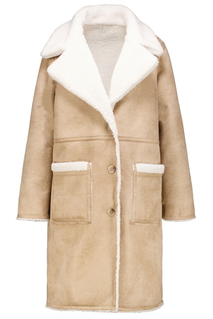 Přechodový dámský kabát imitující ovčí kůži je vyrobený ze 100% polyesteru, takže je možné jej prát v pračce.