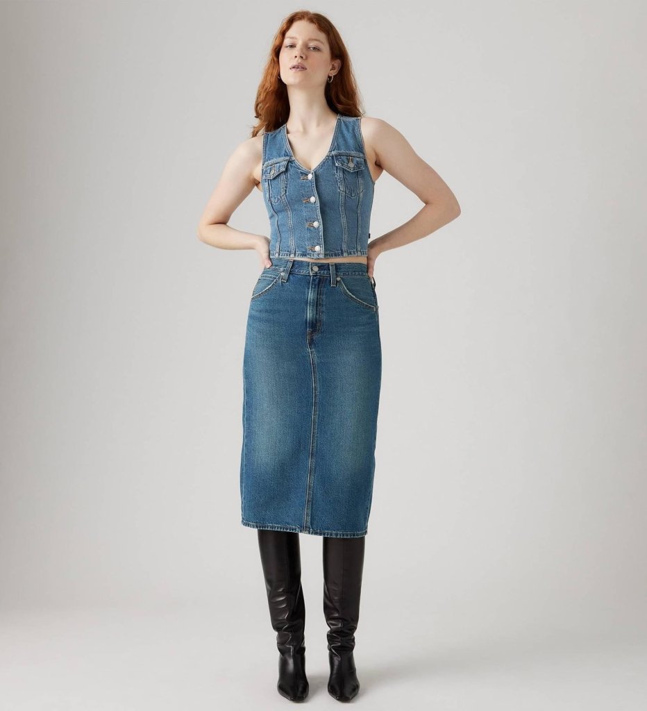 • Džínová sukně inspirovaná vintage stylem • Střih s úzkým střihem • Rozpark na zadní straně Další informace • Džíny perte maximálně jednou za 10 nošení, čímž prodlužujete jejich životnost a šetříte přírodní zdroje. Perte v pračce za studené vody, nebělit, sušit v sušičce na střední teplotu, v případě potřeby žehlit za horka, možné chemické čištění, prát naruby s podobnými barvami • Styl s 5 kapsami • Nepružné